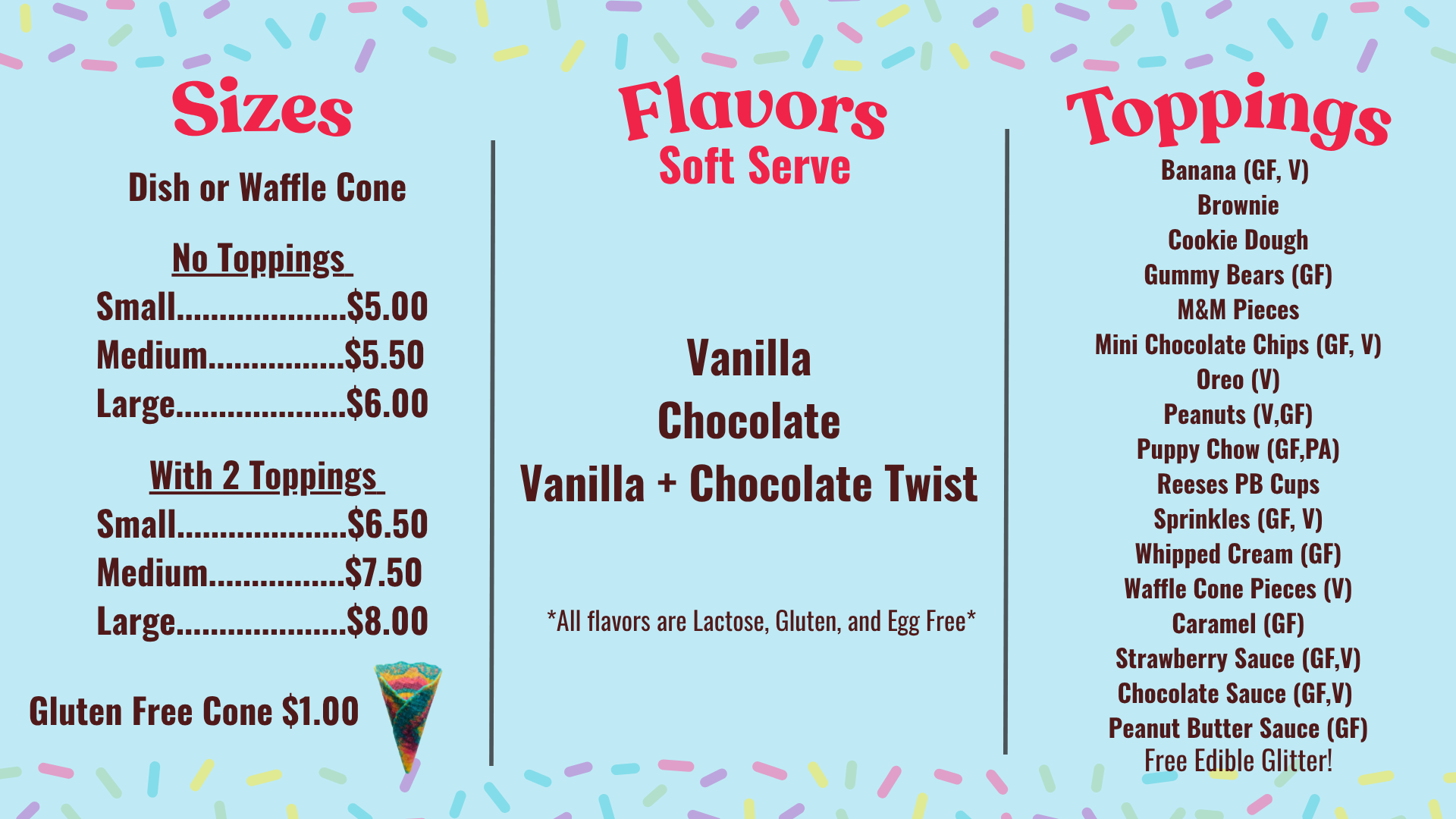 We cater to a variety of dietary needs! We aim to offer an exceptional ice cream experience for all. Please click the button below to view our full allergy guide to see what options are available for your diet.