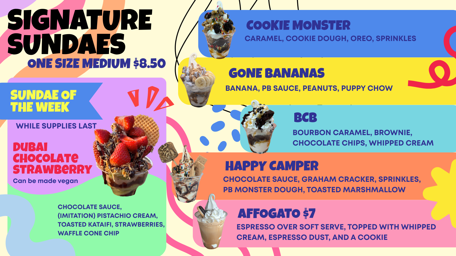 VANILLA, CHOCOLATE, BURNT SUGAR (Vegan, Made w/ Oat Milk), BLUEBERRY ACAI (Vegan, Made w/ Oat Milk)