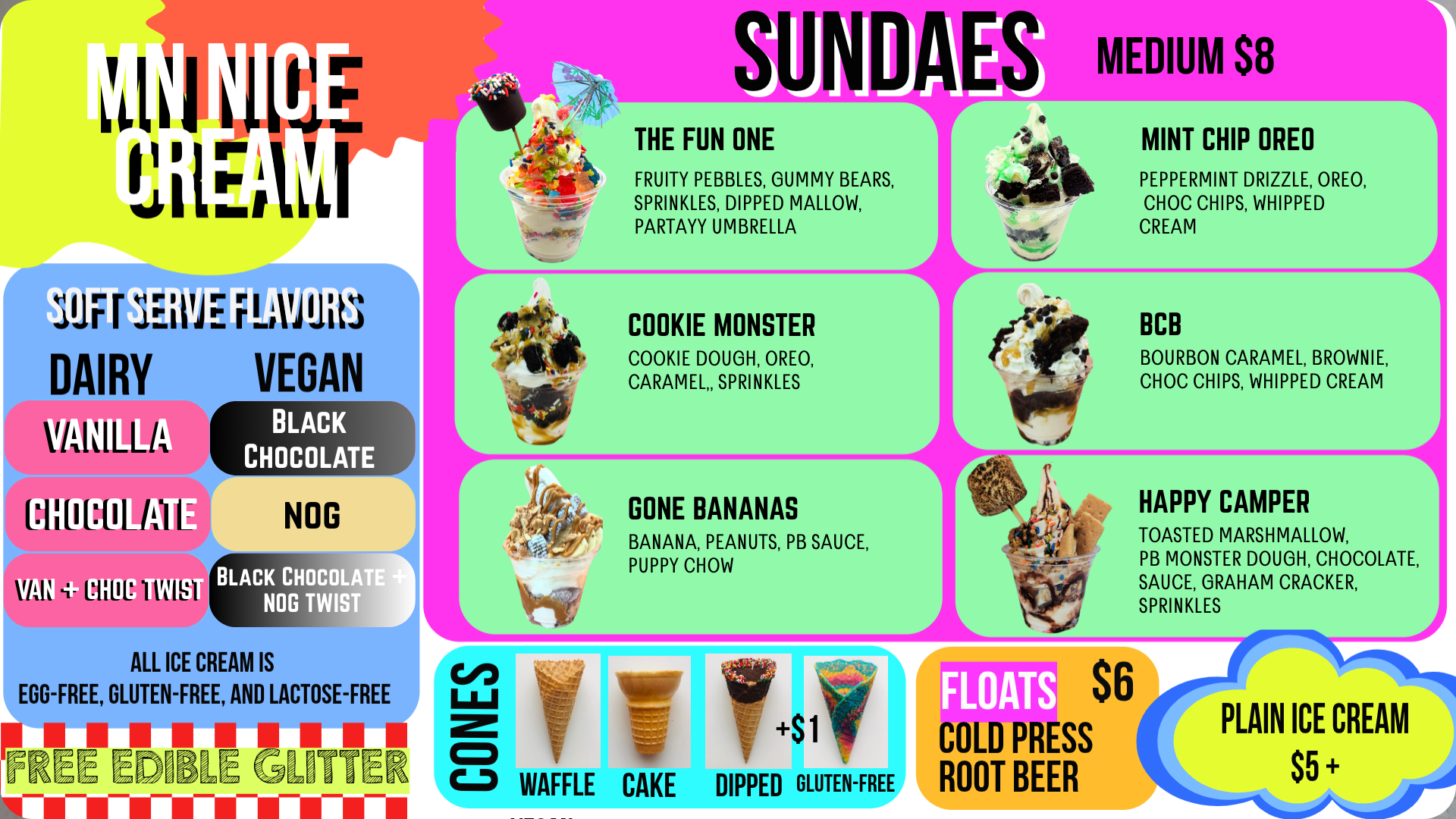 Minnesota Nice Cream was launched by Katie Romanski in March 2016. Inspired by her memories of cold soft serve on hot Mid-Western summer days, Romanski sought to provide customers a nostalgic dessert experience with a twist. Along with the help of the sweetest little truck in town, Romanski has traveled the Midwest sharing her delicious masterpieces. Minnesota Nice Cream has been a featured truck at Rock the Garden (2016), Eaux Claires Music Festival (2016, 2017, 2018), and a staple at breweries and block parties throughout Minnesota. Minnesota Nice Cream was proud to be named one of the Top 5 Food Trucks in Minneapolis - St. Paul by City Pages in 2017, and featured in The Star Tribune, WCCO, and Buzzfeed.